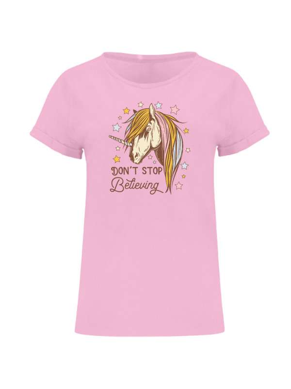 Dámské tričko volnějšího střihu s krátkým rukávem. Kulatý výstřich ze stejné látky, zpevněné skryté švy. Ukončení rukávů s ohrnutím s přišitím ve 4 bodech. Boční švy.